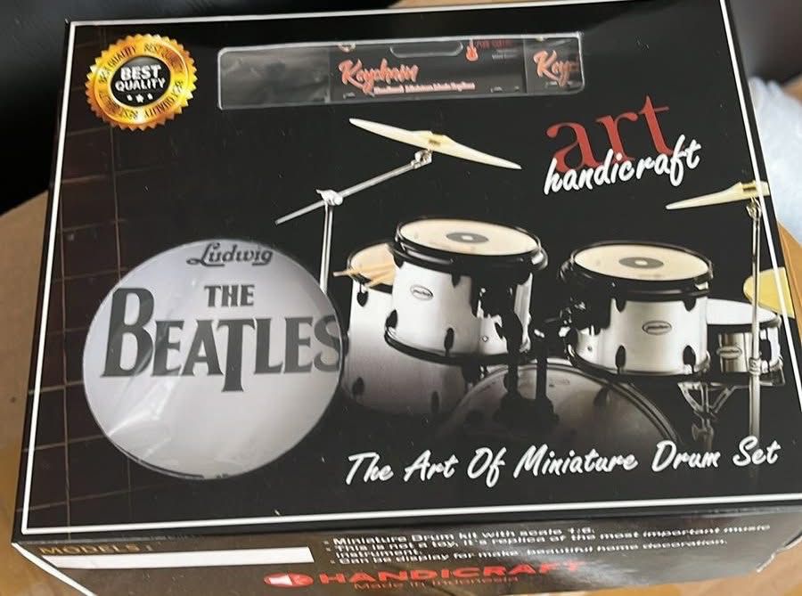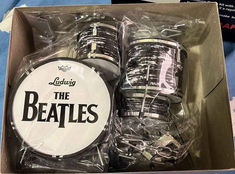 Set en miniatura para coleccionistas y amantes de The Beatles, con la batería de Ringo Starr, la épica guitarra Rickenbacker de John Lennon y la guitarra de George Harrison así como el bajo Hofner de Paul McCartney.